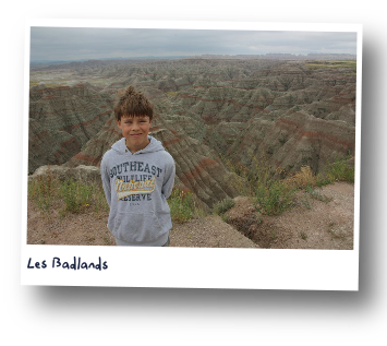 Les Badlands. De géantes montagnes et canyons ressemblant à des coulées de boues s'étalant par terre. Il y a des serpents à sonnettes et nous devons rester sur le chemin balisé pour éviter de se faire mordre les orteils ! De loin, les montagnes sont divisées horizontalement et alternativement par une trentaine de stries de couleur rouge ou blanche, ce qui donne l'impression que des fils électriques se dressent devant les montagnes.