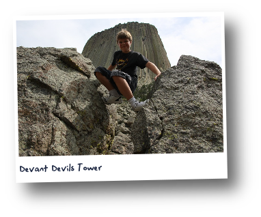 Devils Tower. Imaginez-vous devant un volcan dénudé de son contour, formant une tour de 200 m de haut et vous êtes devant Devils Tower autrement dit la tour du diable. j'ai aussi eu la chance de pouvoir admirer l’abdomen d'une veuve noire (araignée la plus vénéneuse au monde) nichant dans un terrier de chien de prairie à queue noire logeant tout autour du volcan. J'en ai vu un à 30 cm.
