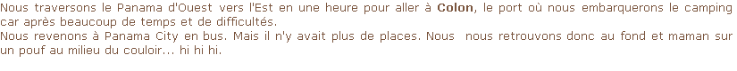 Aujourd'hui, c'est très excitant car nous arrivons enfin dans les légendaires bureaux (légendaires pour les voyageurs) de Evelyn Batista. Elle organise tout pour pouvoir passer du Panama en Colombie ou vice-versa par bateau. En effet, entre le Panama et la colombie, il n'y a pas de route ni même de pistes. Ce n'est que la jungle.