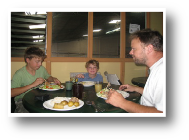 Ce soir, nous avons rendez-vous avec André et Danielle, des amis de Nadia, en vacances dans la région, qui nous apportent dans leurs valises des nouvelles de chez nous (mmmh) et... des cours du CNED (hhhhm). Nous passons un petit moment à faire connaissance. Encore merci aux facteurs !