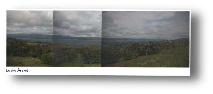 Nous partons rapidement sur les hauteurs pour trouver la fraîcheur près du lac Arenal. Le paysage change drastiquement pour nous mener dans de véritables alpages suisses. La vue surplombant le lac créé par le barrage vaut bien une photo. Aussi nous nous arrêtons sur un point de vue où se sont installés des vendeurs d'artisanat local. Les garçons sortent immédiatement repérer des petits souvenirs. Une des conditions, ils la connaissent, c'est que le souvenir doit être... petit et marchandé. Et oui, si nous les laissions faire, nous serions rapidement vendeurs ambulants nous même. La vue ressemble à s'y méprendre à un paysage suisse. Si un paneau n'indiquait pas en espagnol que le lac en contre-bas abrite des crocodiles qui peuvent attaquer l'homme on se croirait à la maison (les crocodiles suisses c'est très rare...).