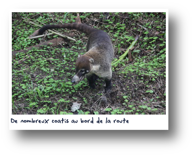 C'est alors que, tout comme si nous habitions dans la même rue, Anja, Holger, Maryline et Vincent s'arrêtent à côté de nous. Et oui, encore une rencontre. Nous échangeons quelques mots et à vrai dire ça tombe à pic. Ces derniers jours, depuis le Guatemala ont été assez durs et les visites que nous avons faites depuis plusieurs semaines n'ont pas été transcendantes. Nous avions l'impression de ne plus voyager correctement, où peut-être d'avoir perdu le mordant nécessaire pour une telle aventure... Car il s'agit bien d'une aventure avec ses moments incroyables et ses difficultés à surmonter. Nous comprenons vite que nos amis voyageurs ressentent un peu la même chose et souffrent également de la chaleur. Ils ont aussi maintenant envie d'accélérer pour arriver au plus vite en Amérique du sud. Nous ne sommes pas les seuls à faire ces constations. Sur la route, traversée par de nombreux coatis, nous appercevons brièvement, privilège suprême, le volcan Arenal,