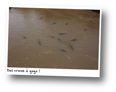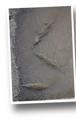 Après devoirs, menues réparations et nettoyage (ça c'est un truc qui ne s'arrête jamais), nous roulons vers Jaco. Sur le chemin un pont enjambe une rivière pleine de gros, gros cro-cro crocodiles. Certains mesurent 4 ou 5 mètres. Evidemment on s'arrête et on observe. Une rivière dans laquelle il ne faudrait certainement pas tomber. Mais c'est fascinant. Je repense à mon Grand-Père à Madagascar, qui, ne comprenant pas pourquoi tant de gens venaient assister aux baptèmes qu'il pratiquait dans la rivière s'est vu dire après-coup que l'endroit était infesté de crocos !