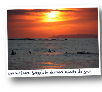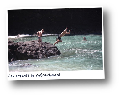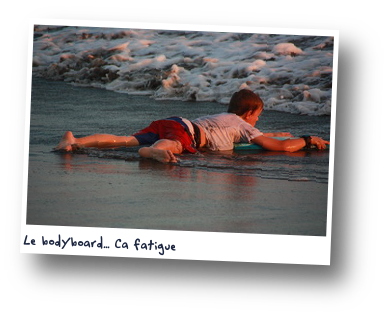 Après les devoirs nous courons encore profiter de cette plage et surtout de la fraîcheur que procure l'eau. Entourés d'apprentis surfeurs allemands, français et américains nous surveillons nos apprentis "bodyboarders" à nous qui s'éclatent sur les vagues. Théophile en particulier est porté très loin sur la plage car il est plus léger... Il n'y a pas que des désavantages à être le plus petit...