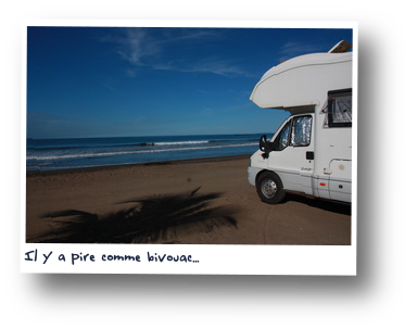 Nous profitons même d'un connection wifi sur la plage dans le camping car pour appeler les petits neveux et nièces sur Skype. Sur l'ordinateur en direct ils nous montrent le Mont-Blanc sur lequel se couche le soleil et nous leur montrons le Pacifique.