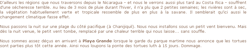 Le pays nature d’Amérique Centrale. Nous l’avons apprécié pour sa beauté sauvage mais nous avons eut si chaud que nous avons parfois eut du mal à l’apprécier pleinement.